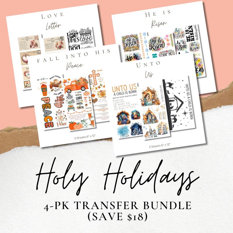 Why wait for the right project when you can be ready all year long? Our Holy Holidays 4-Pack gives you Scripture-filled transfers for Easter, Fall, Christmas, and Love — all in one discounted bundle.