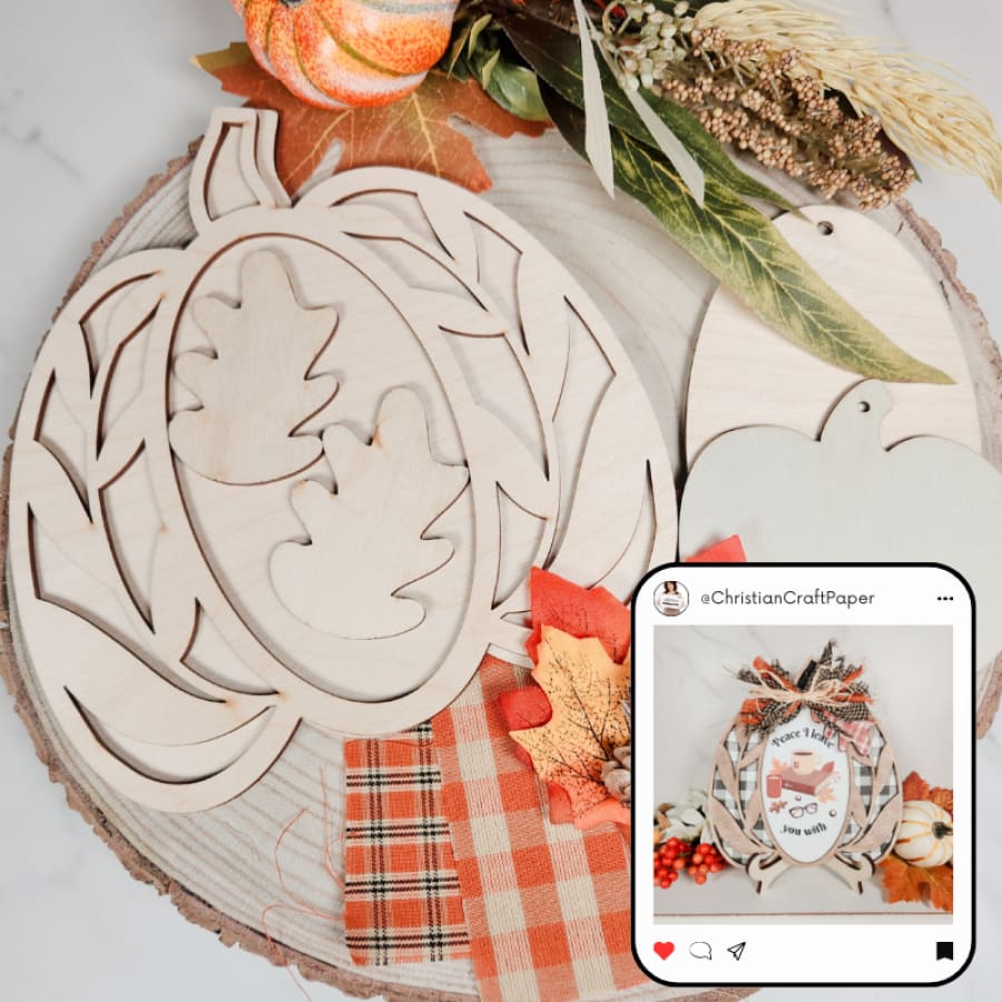 Includes: One pumpkin base, frame topper, oval insert two wooden leaf 2" wooden cutouts, two 5x5" fabric swatches